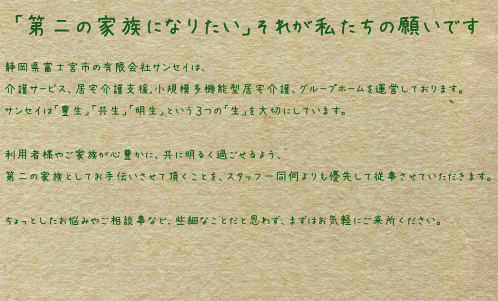 静岡県富士宮市の有限会社サンセイは、介護サービス、居宅介護支援、小規模多機能型居宅介護、グループホームを運営しております。